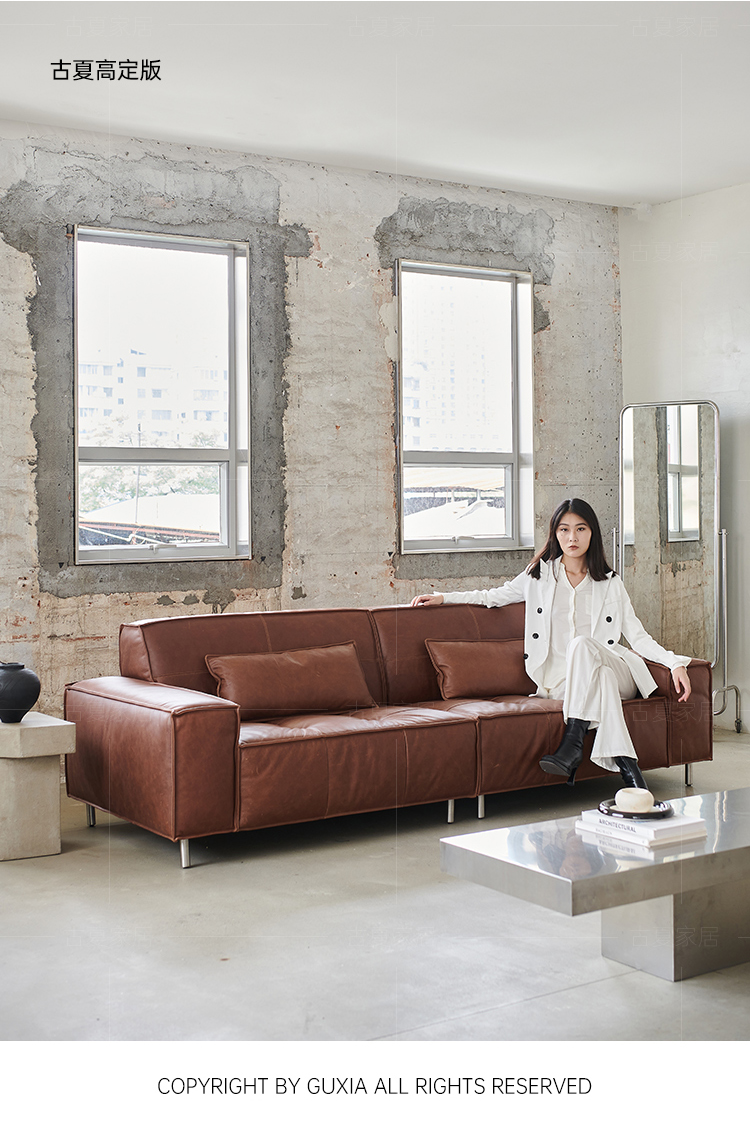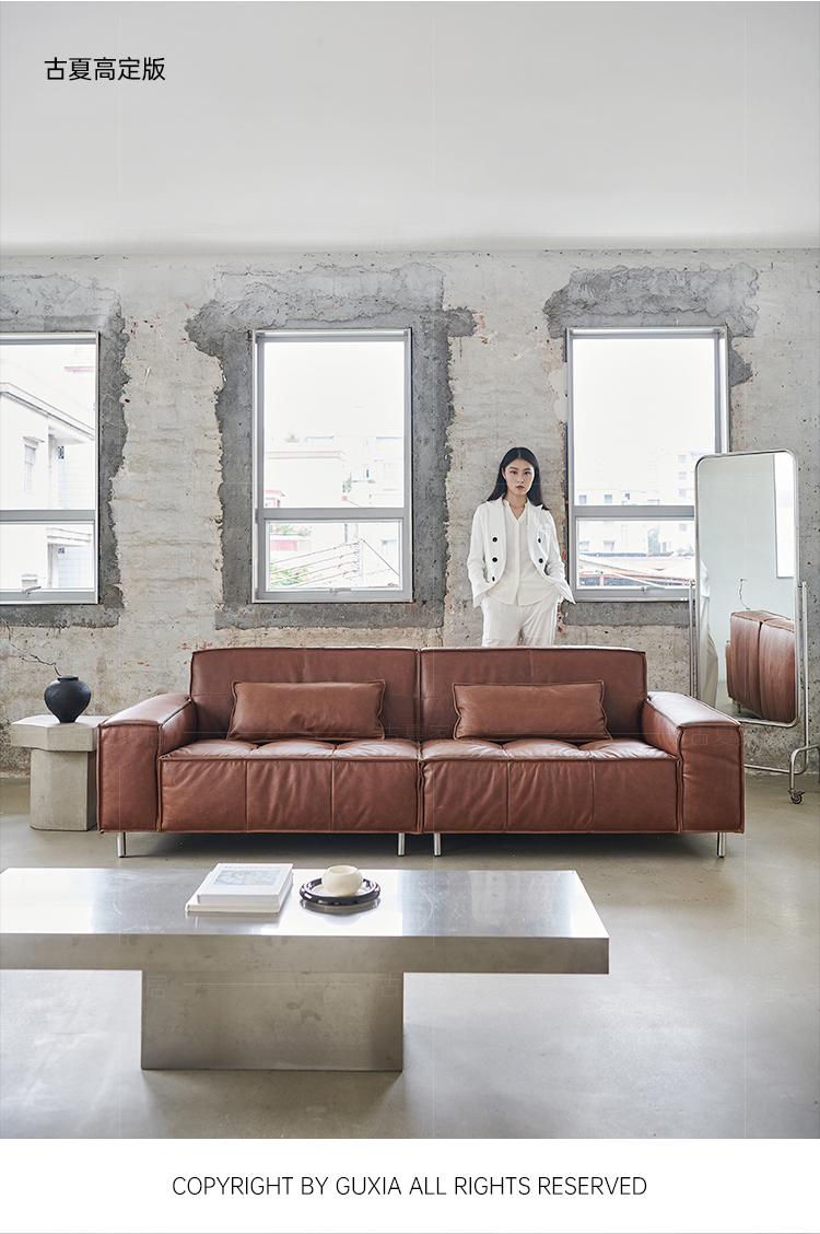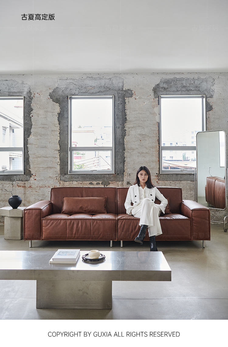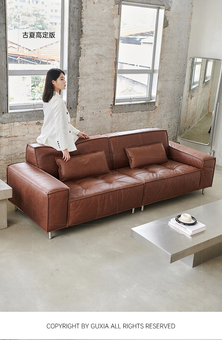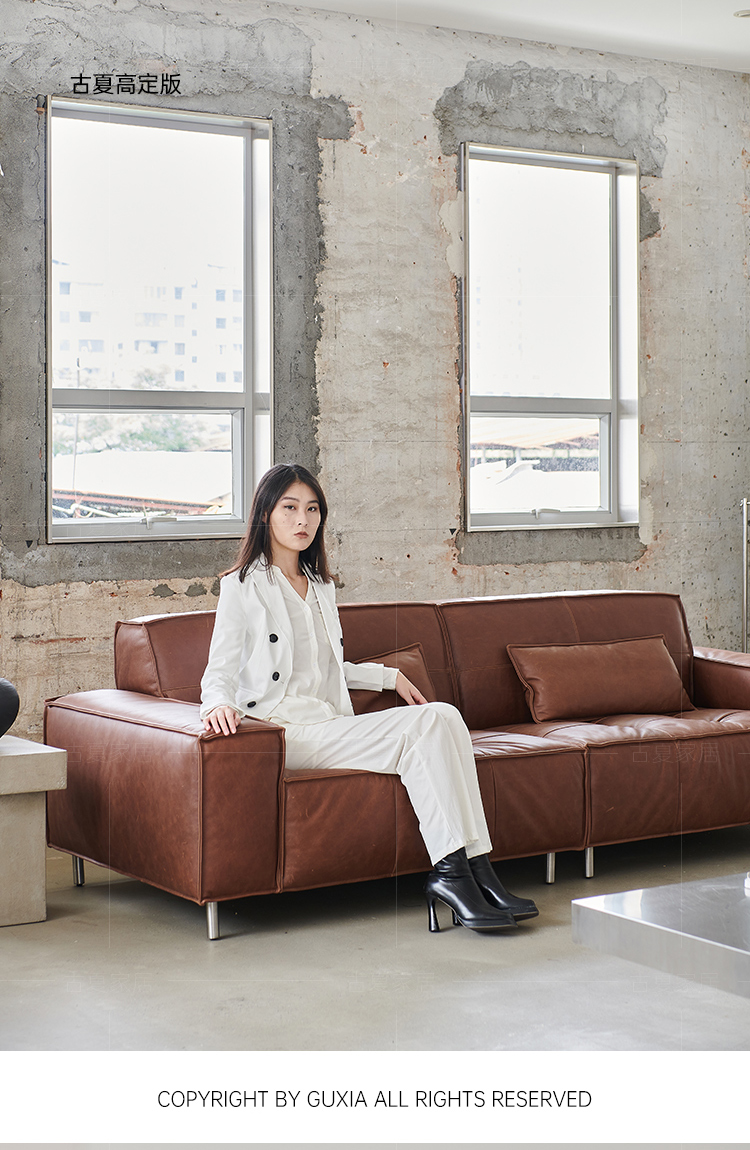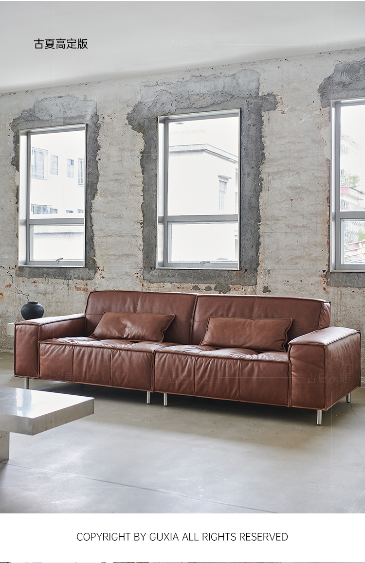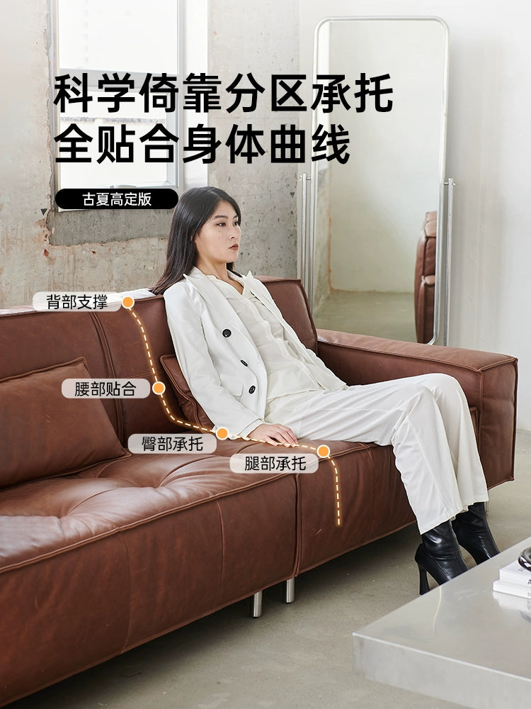 French Retro Oil Wax Leather Sofa Minimalist Tofu Block Straight Row Three-person Small Apartment Living Room Medieval Sofa
